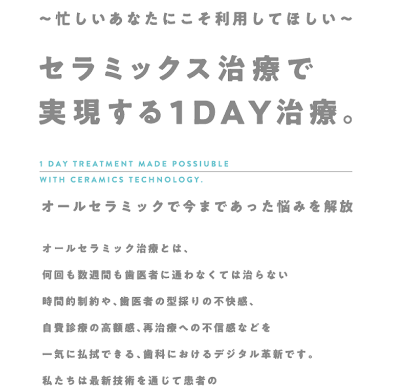 制作までを全て国内の技術者が担当し、診察から治療までを一日で行うため、安心してご利用いただけます。