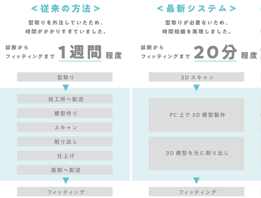 時間がかかっていた型取りから削り出しまでの工程もすべてコンピューターで行うため、フィッティングまで完了します。