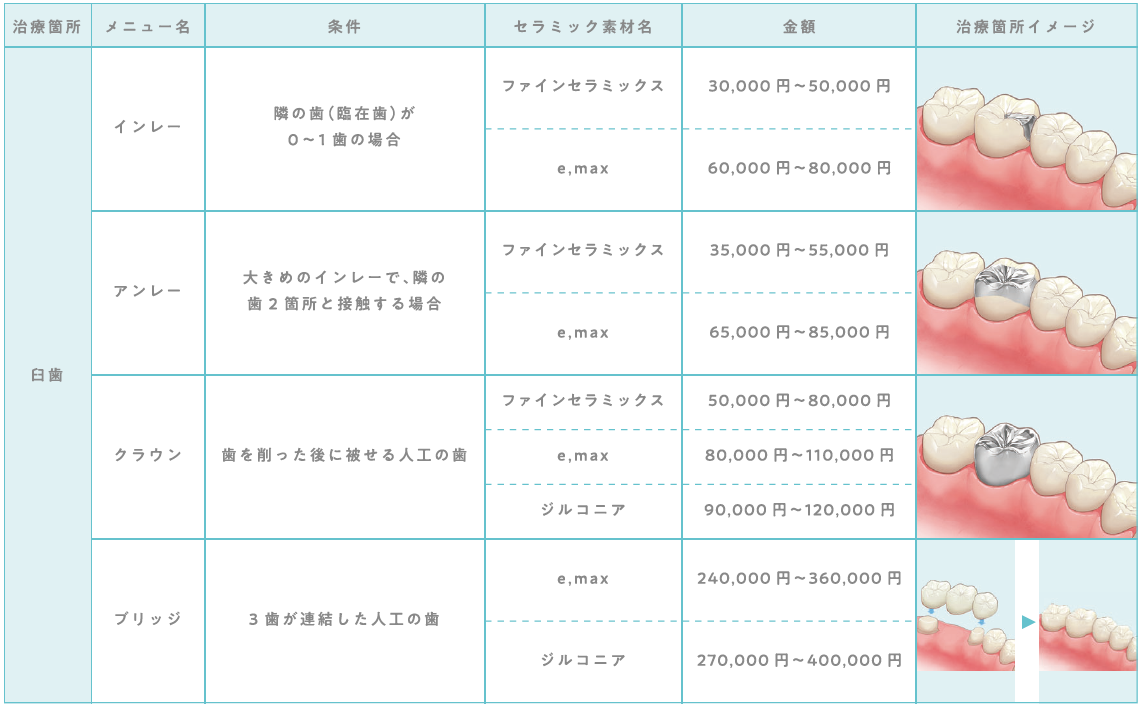 | 大きめのインレーで、隣の歯2箇所と接触する場合 | 120,000円〜170,000円 | |